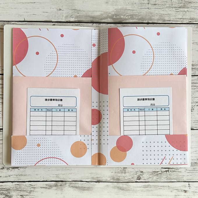 ファイルを開き、添付している請求書兼領収書に記入してから挟み込んでいきます。