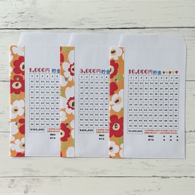 1,000円、5,000円、10,000円の貯金封筒を、ファイルに収納出来るように作りました。