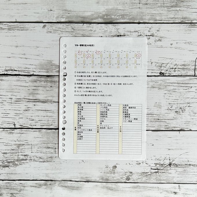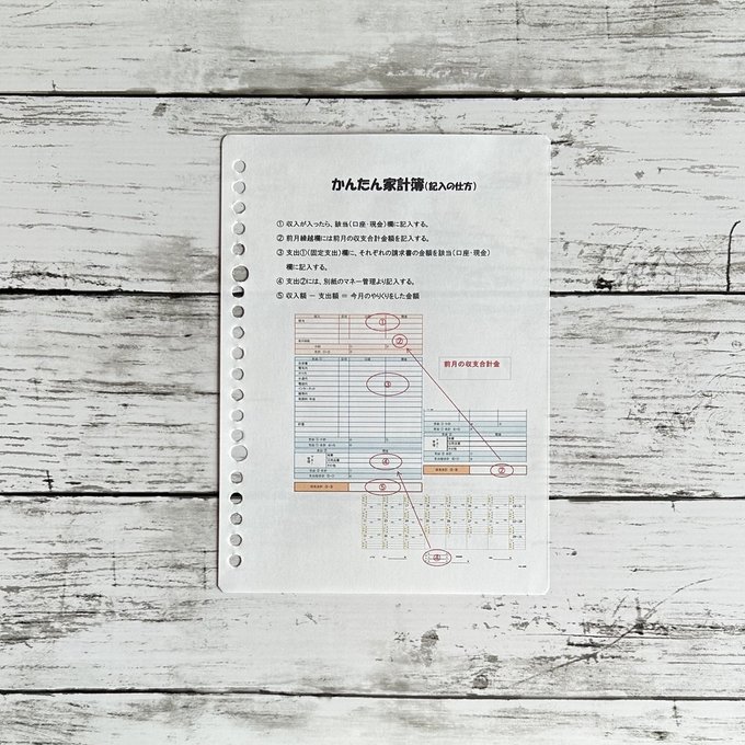 収入欄 支出欄(食費・日用品・その他)残高欄がありますので、お金の動いた日に記入します。