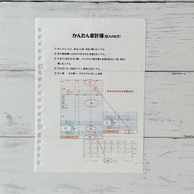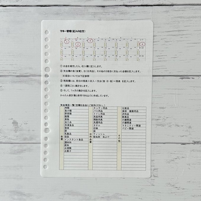 収入欄 支出欄(食費・日用品・その他)残高欄がありますので、お金の動いた日に記入します。